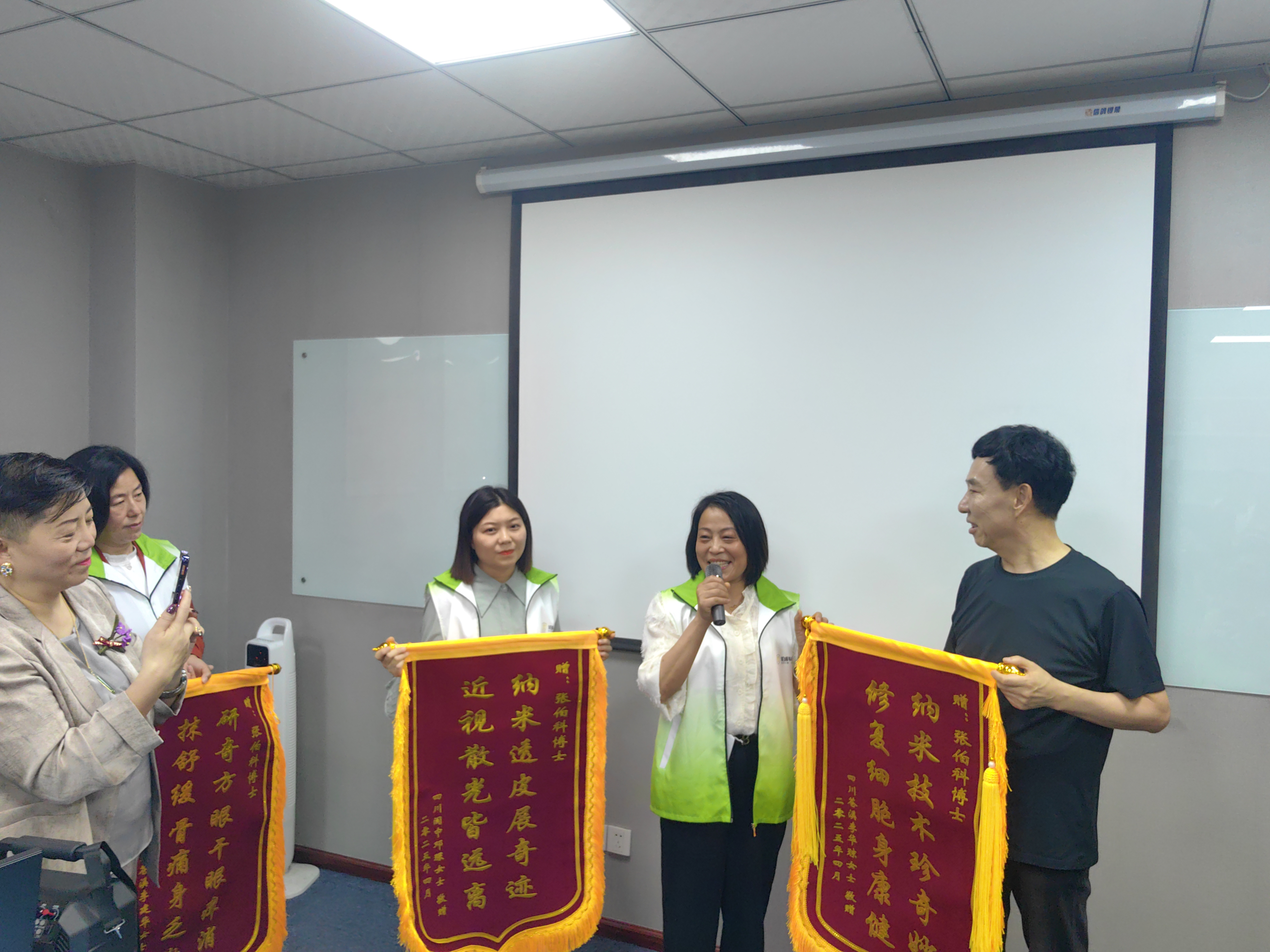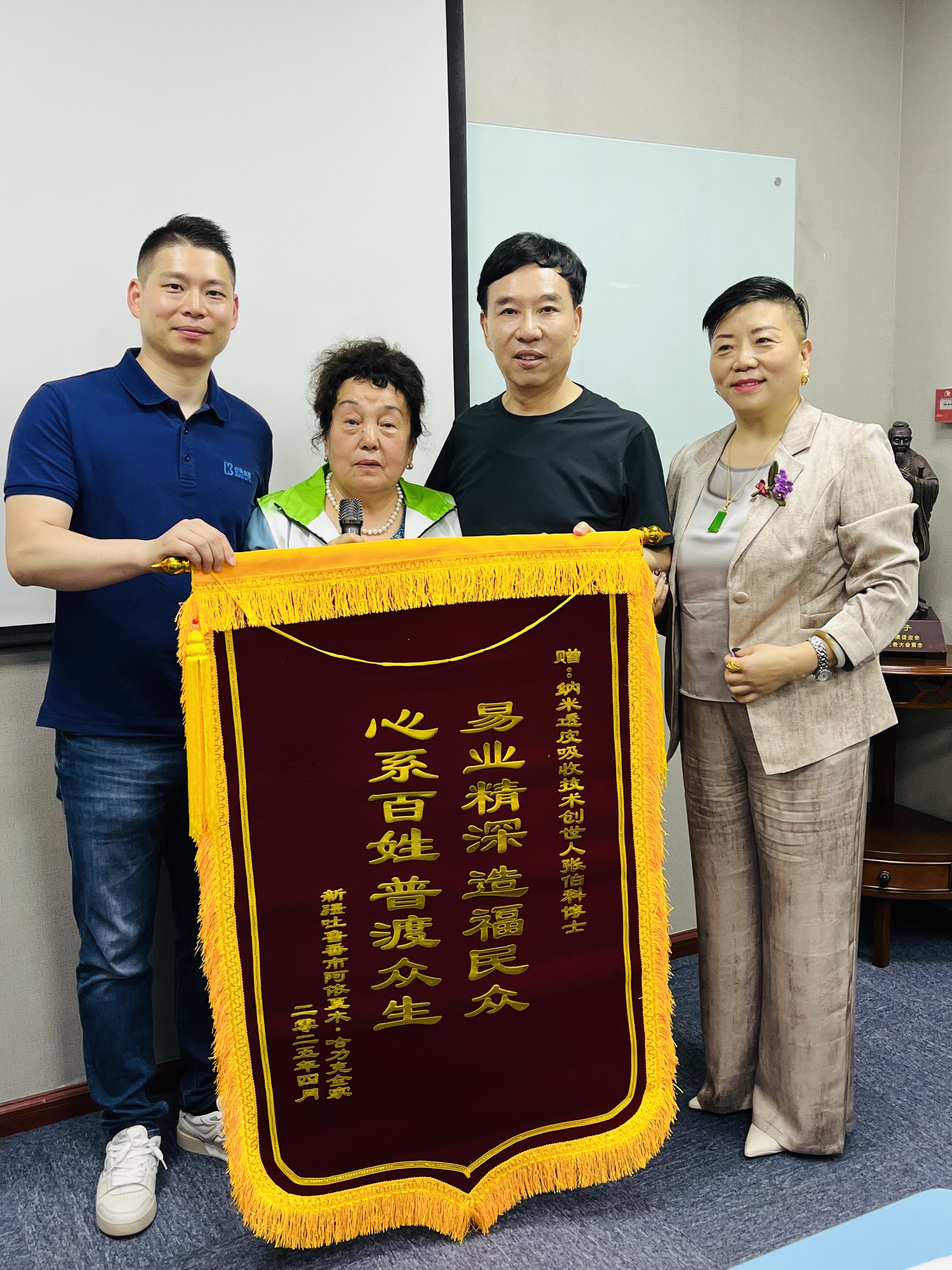 來(lái)到公司的優(yōu)秀代理商們帶著遠(yuǎn)方受益客戶的囑托,向張伯科博士獻(xiàn)上深情致謝的錦旗。這一面錦旗不僅是對(duì)產(chǎn)品效果和公司的認(rèn)可,更是對(duì)張伯科博士始終秉持"科技為民、創(chuàng)新報(bào)國(guó)"精神的贊美之情。